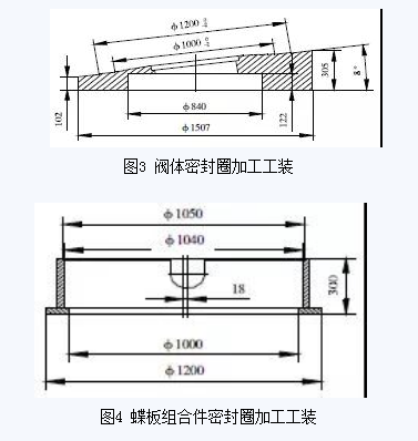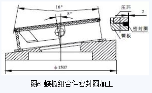 蝶板組合件起密封作用的零件是密封圈,密封圈為斜錐結構,其錐頂角為16°,厚度為13.5mm,由5層石棉板及4層不銹鋼板復合而成(圖6)。密封圈必須與蝶板和壓環等組裝在一起,加工時才能防止密封圈夾層中的不銹鋼板及石棉板翹曲變形。根據其結構特點,對蝶板組合件密封圈采用以下加工方法:(1)先在2.5m立車上分別把蝶板和壓環上的各止口加工到圖紙要求尺寸,外圓不加工;(2)按圖紙要求對壓環鉆孔,蝶板鉆孔攻絲;(3)壓環、密封圈和蝶板按圖紙裝配,將蝶板組合件工裝用螺栓緊固在閥體工裝上,然后再將蝶板組合件裝夾其上。立車刀桿旋轉8°車壓環、密封圈和蝶板至磨削尺寸;⑷用同樣厚度鋼板替下密封圈,車壓環、蝶板各錐面至圖紙尺寸;(5)工裝不動,將壓環、密封圈、蝶板重新按要求組裝,然后在立車刀架上裝磨頭,對密封圈進行磨削處理,使其達到圖紙設計粗糙度要求。