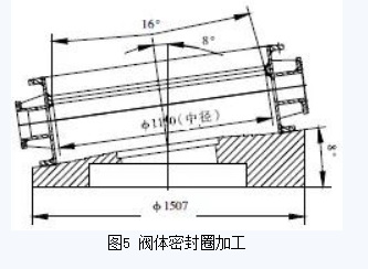 閥體起密封作為的為密封圈,焊接在閥體內(圖5)。在2.5m立車上將組焊好的閥體裝夾在閥體密封圈加工工裝上,將立車刀桿旋轉8°,根據圖紙設計要求,找正后沿圓錐母線方向走刀,車至未焊不銹鋼前的尺寸。然后堆焊不銹鋼,最后將焊好不銹鋼的閥體重新上立車,按上述方法車閥體密封圈至圖紙要求尺寸。最后在立車刀架上裝磨頭,對閥體密封圈進行磨削處理,使其達到圖紙設計粗糙度要求。