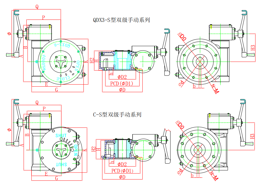 該系列是小蝸輪箱與大蝸輪箱對接組合成為二級傳動蝸輪減速增壓機構,提高了機械總效率,輸入小力矩,開動大閥門,使操作人員省力,每種型號提供多個傳動比,特殊型可輸出360°無限多回轉,能更好的匹配不同規格的閥門。